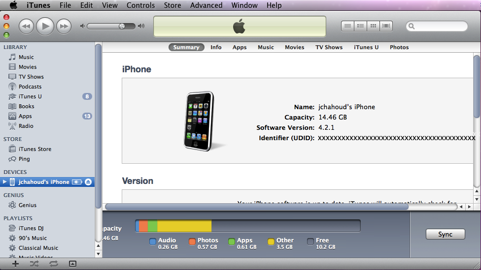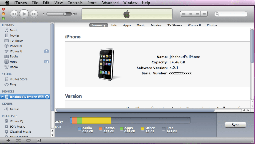 2. No lado direito da janela do iTunes, localize os dados de seu iPhone , incluindo o nome, capacidade, versão do software e numero de série (que pode estar em português ou inglês dependendo da versão do iTunes instalada)