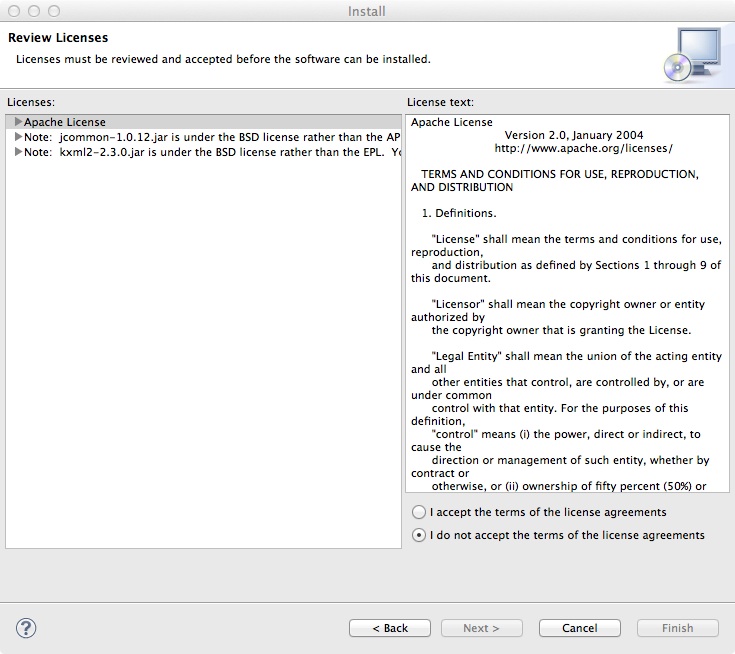 f) Leia e aceito os termos de licença, depois clique em Finish e reinicie o Eclipse