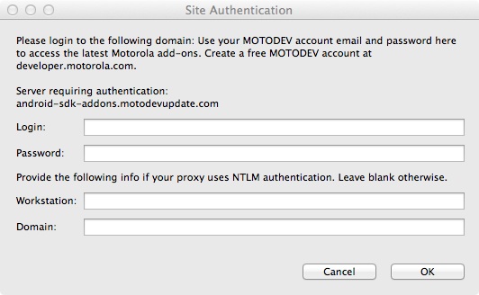 Poderá ser necessário entrar com um login e senha do site de desenvolvedor da motorola. Se for o caso a seguinte caixa de diálogo será exibida: