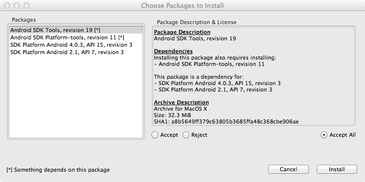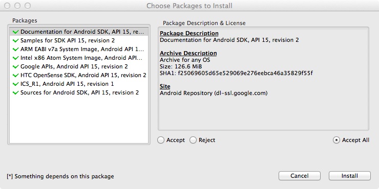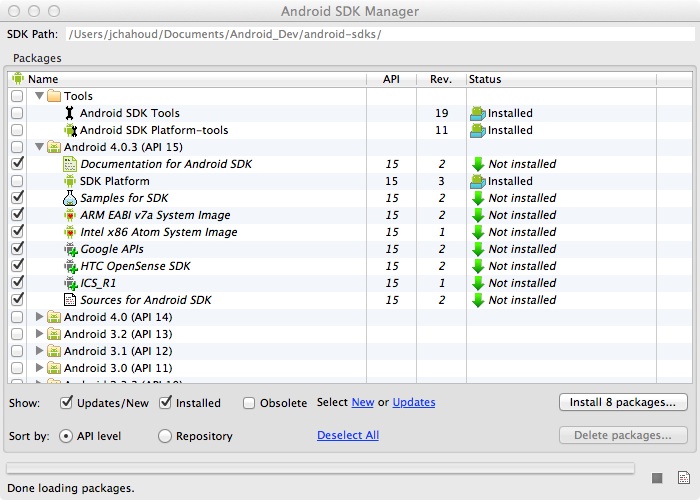 O gerenciador será aberto. Selecione todos os pacotes debaixo da versão mais recente (no meu caso 4.0.3) e clique “Install”