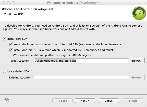 Neste exemplo, vou baixar uma nova versão do SDK, selecionando Install New SDK. No campo “Location” selecione a pasta desejada para instalação do SDK do Android. Essa pasta pode ser qualquer uma dependendo da preferência de quem for usar, alguns desenvolvedores colocam em ~/opt/local/android-sdk-mac outros em /Developer/android-sdk-mac. Para ilustrar coloquei na pasta de meu usuário mesmo. Clique em Next
