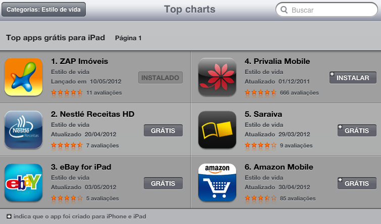 Melhor posição no ranking: Atingiu primeiro lugar na app store brasileira na categoria “Estilo de Vida” (Lifestyle) em maio/2012