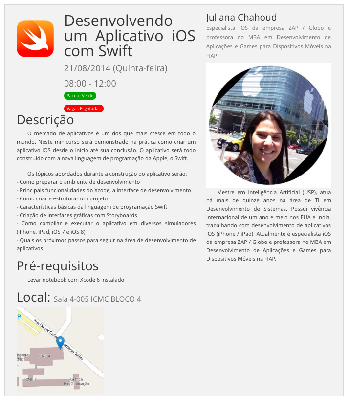 No dia 21/08, foi a vez de dar um pulo em São Carlos e trocar experiências com o pessoal do ICMC – USP, durante 17a Semana da Computação. Na parte da manhã dei um minicurso com o tema: Desenvolvendo um Aplicativo iOS com Swift.